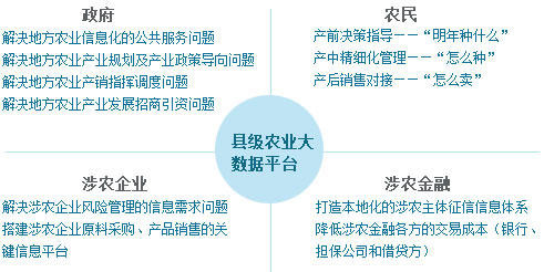 县一级平台是涉农信息产生、汇集、存储、应用挖掘的滩头阵地,也是将数据和信息整合后应用于产业规划、经营指导以及精准生产的前沿指挥,更是县域农业资源与外界产业资本、农业科技、金融服务、人力资源等关键要素联接的枢纽。