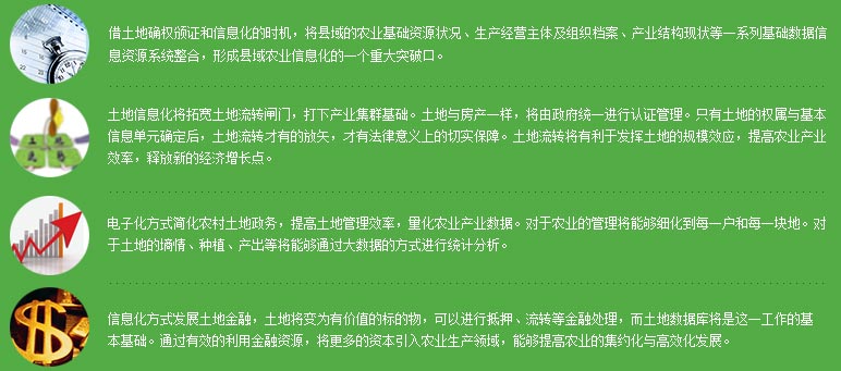 在中央政府的大力扶持和推动下,随着农村土地承包经营权确权、登记、颁证以及信息应用平台的建设,县级政府有望第一次将辖区内土地资源及其经营主体的信息进行数字化管理。